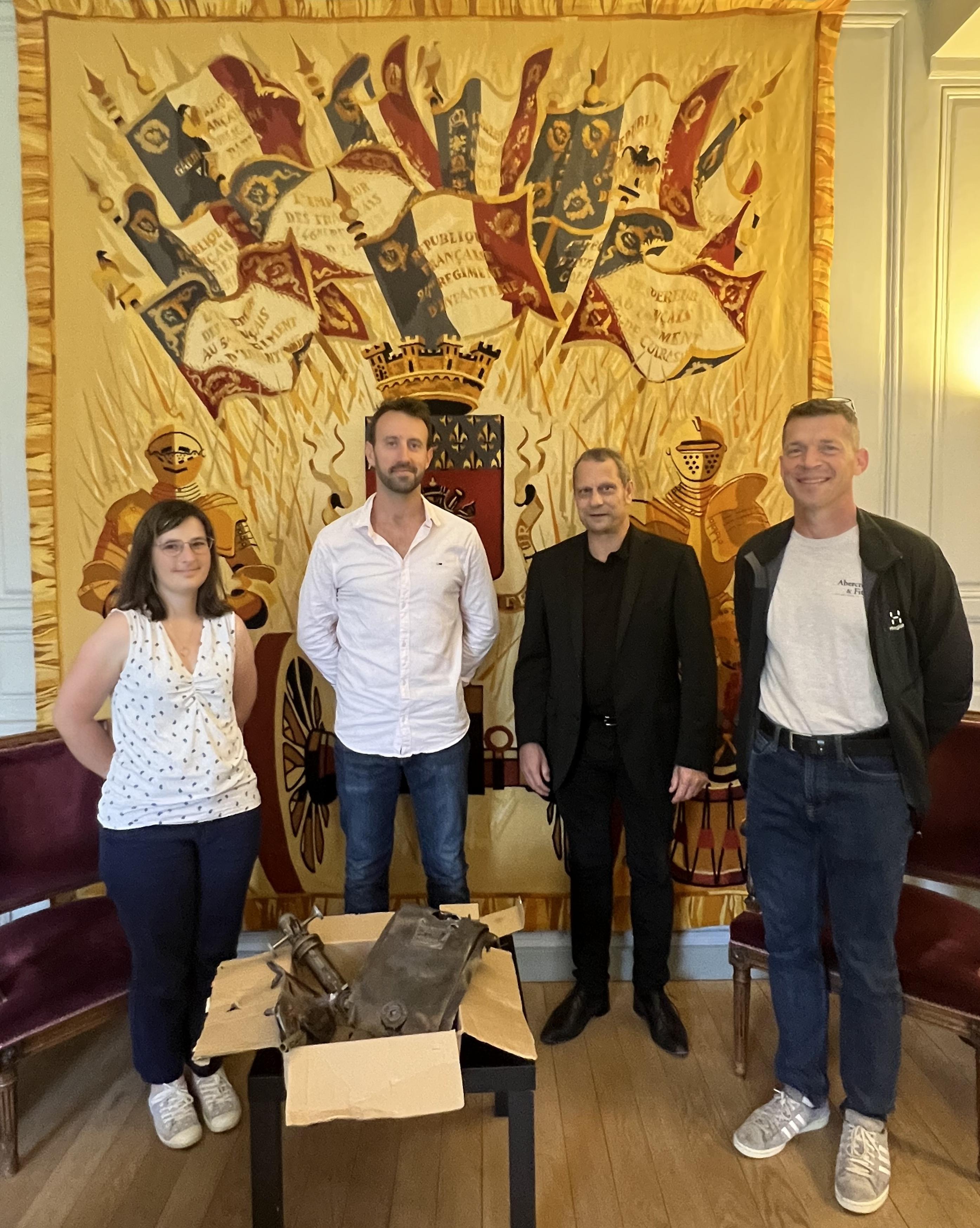 Le général Christian Baptiste, le conservateur du musée Vladimir Trouplin et la régisseuse des œuvres Margot Durand, ont pu échanger avec les donateurs sur la mission de commémoration du 5 mars 2024, moment d’intense émotion réalisé 83 ans après le posé dramatique du Blenheim n°T1867 du sergent Le Calvez au nord-est du Tchad.