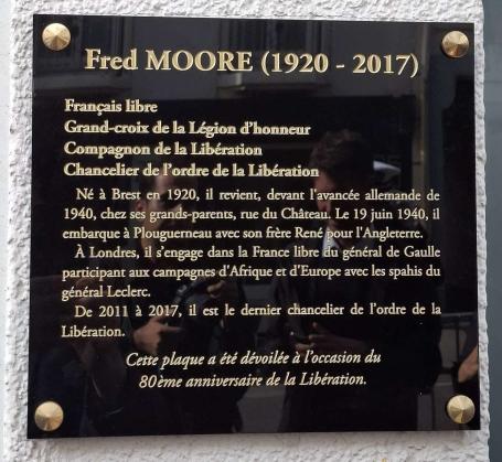 Dans le cadre du 80e anniversaire de la Libération de Brest, le maire a rendu un hommage à Fred Moore, Compagnon de la Libération, grand'croix de la Légion d'honneur et dernier chancelier de l'Ordre de la Libération. Une plaque a été dévoilée au 24 rue du Château à Brest, lieu de naissance de Fred Moore, en présence de Jean-Philippe Setbon, sous-préfet de Brest, d'élus de la ville et de membres d’associations mémorielles.