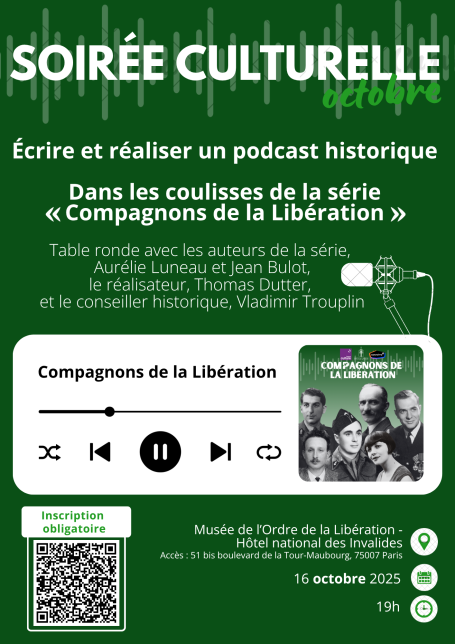 Pour la soirée culturelle du mois d’octobre, le musée vous propose de découvrir les coulisses de la création du podcast Compagnons de la Libération, une série immersive qui donne vie aux parcours de 6 héros.
