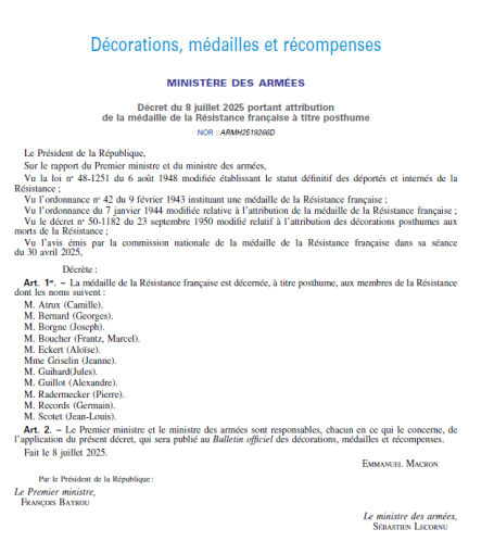 Par décret du président de la République en date du 8 juillet 2025, publié au Bulletin officiel des décorations, médailles et récompenses du 1er septembre 2025, faisant suite à l’avis émis par la commission nationale de la médaille de la Résistance française dans sa séance du 30 avril 2025, la médaille de la Résistance française est conférée à titre posthume à madame Jeanne Griselin, ainsi qu’à messieurs Camille Atrux, Georges Bernard, Joseph Borgne, Frantz Marcel Boucher, Aloïse Eckert, Jules Guihard, Alexandre Guillot, Pierre Radermecker, Germain Record et Jean-Louis Scottet.
