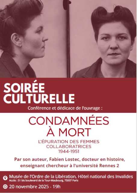 À l’occasion de la soirée culturelle du mois de novembre, le musée de l’Ordre de la Libération vous propose une conférence – dédicace autour de l’ouvrage Condamnées à mort - L'épuration des femmes collaboratrices, 1944-1951, par son auteur, Fabien Lostec.