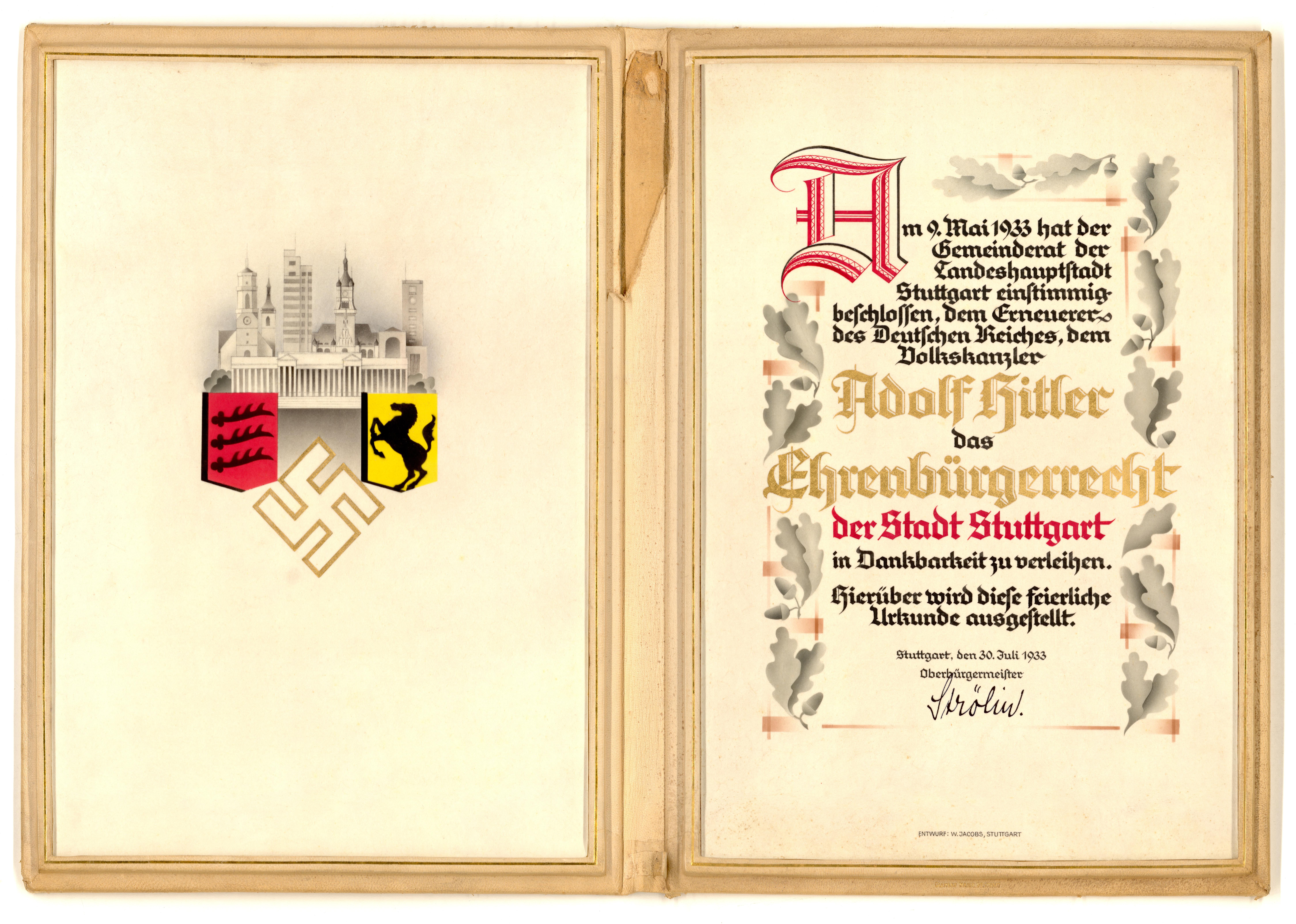 Au milieu des années 1930, les hauts dignitaires du régime nazi s’installent sur le plateau de l’Obersalzberg, quartier de Berchtesgaden en Bavière, à la suite d’Adolf Hitler qui y a fait bâtir sa résidence, le Berghof. Surplombant l’Obersalzberg, le Kehlstein accueille également le « nid d’aigle » d’Hitler. Des soldats de la 2e division blindée du général Leclerc, en avant-garde des troupes américaines, prennent Berchtesgaden le 4 mai 1945 et hissent le drapeau tricolore sur le Berghof et le « nid d’aigle ». Ils s’emparent ainsi de plusieurs prises de guerre dans les résidences d’Hermann Goering, de Martin Bormann ou d’Adolf Hitler. Parmi eux, Geoffroy Frotier de Bagneux, officier de la 2e DB, saisit des objets emblématiques et tout à fait exceptionnels, parmi lesquels la clé du Berghof, la carte de membre des SS d’Adolf Hitler portant le n°1, le livre Erinnerung an Sans-Souci provenant de la bibliothèque personnelle du Führer, un diplôme de citoyen d’honneur de la ville de Stuttgart décerné à Adolf Hitler, un brassard de dirigeant politique du Parti nazi et le fusil de chasse drilling d’Hermann Göring.