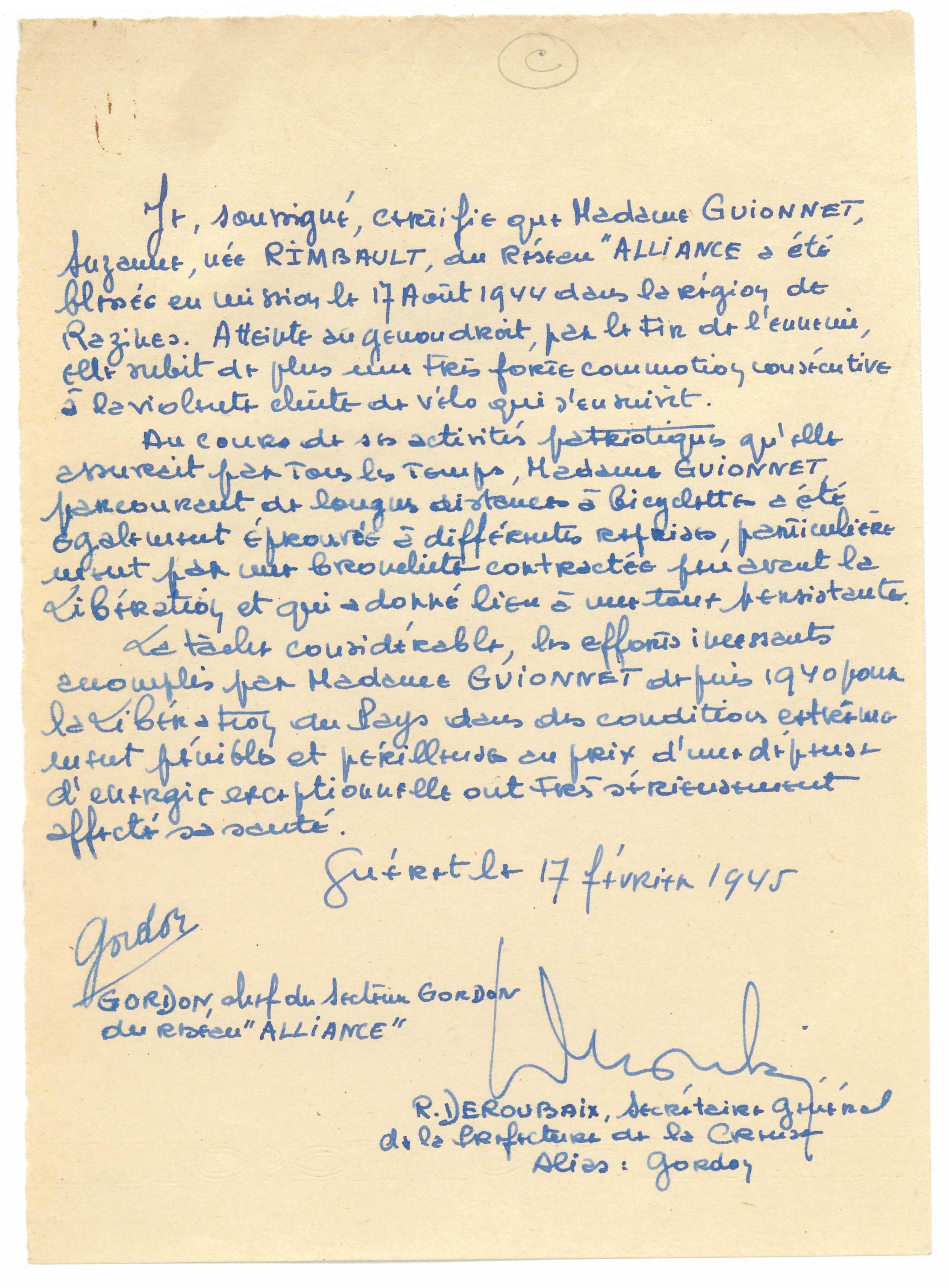 Le fonds remis témoigne à la fois du parcours professionnel de Robert Guionnet, de ses activités résistantes sous l’Occupation, ainsi que de son engagement après la Libération. Il comprend en outre de nombreux dossiers individuels des membres du groupe de résistance de Châtellerault auquel il appartenait, offrant ainsi une source précieuse pour l’histoire locale et pour l’étude des organisations résistantes de la Vienne. Il contient aussi de nombreuses pièces décrivant l’activité de Suzanne Guionnet au sein du réseau de renseignement Alliance.