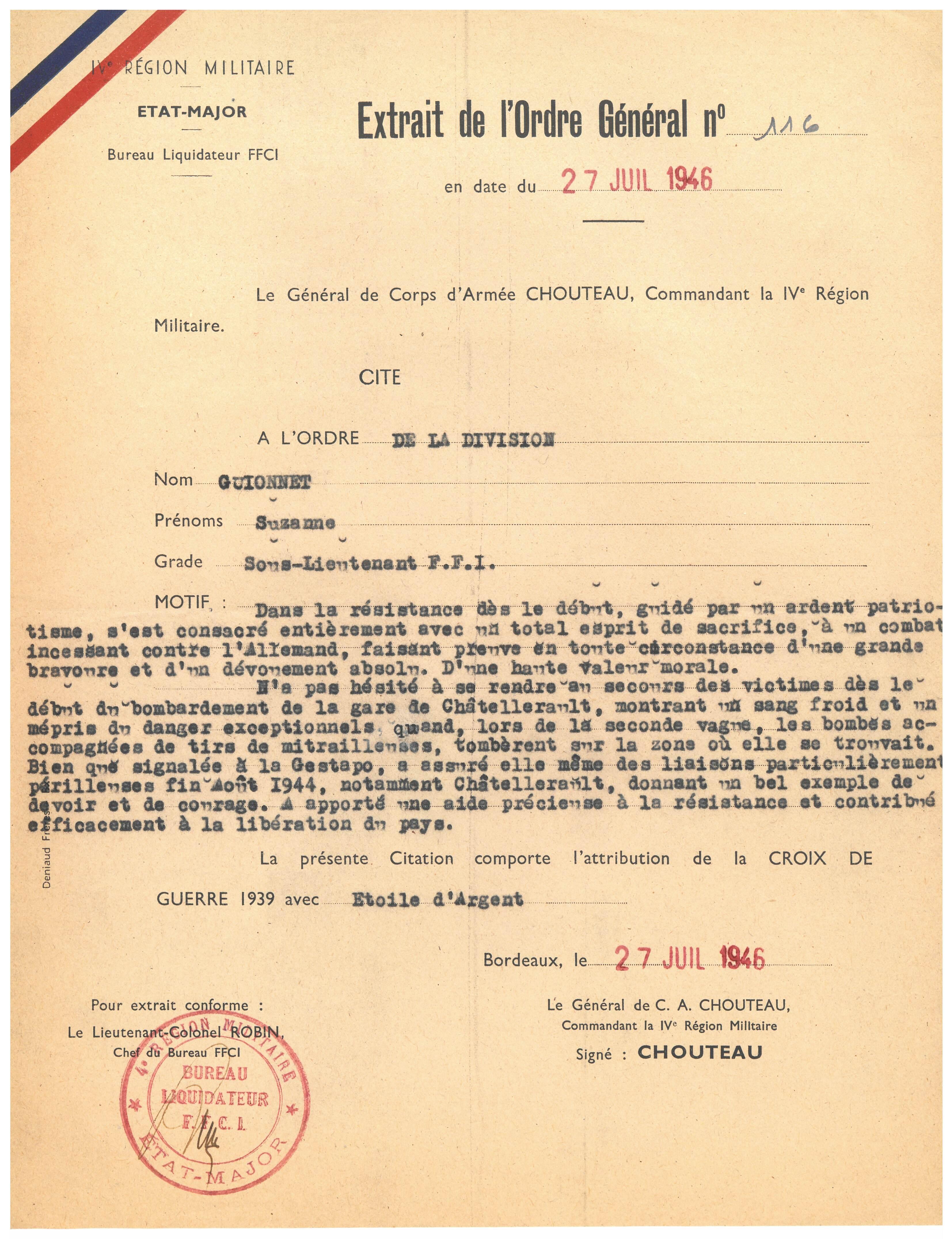 Le 9 juillet 2025, Martin Aleberteau, chargé de gestion documentaire au service de la médaille de la Résistance française, s’est rendu à Poitiers afin de récupérer, auprès de monsieur Robert Aigret, petit-neveu de Robert Guionnet, les archives personnelles de ce dernier. Robert et son épouse Suzanne étaient tous deux médaillés de la Résistance française (avec rosette pour Robert Guionnet).