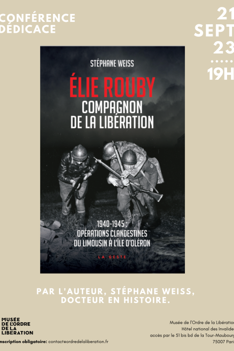 Le 21 septembre Stephane Weiss, docteur en histoire, nous présentera son nouveau livre : Elie Rouby, Compagnon de la libération..